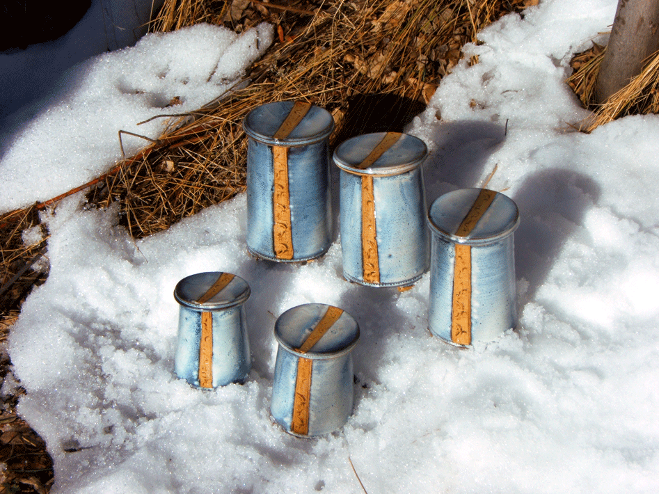 Quelques pièces expriment mon interêt pour les émaux de grès classiques (coupes et vases).