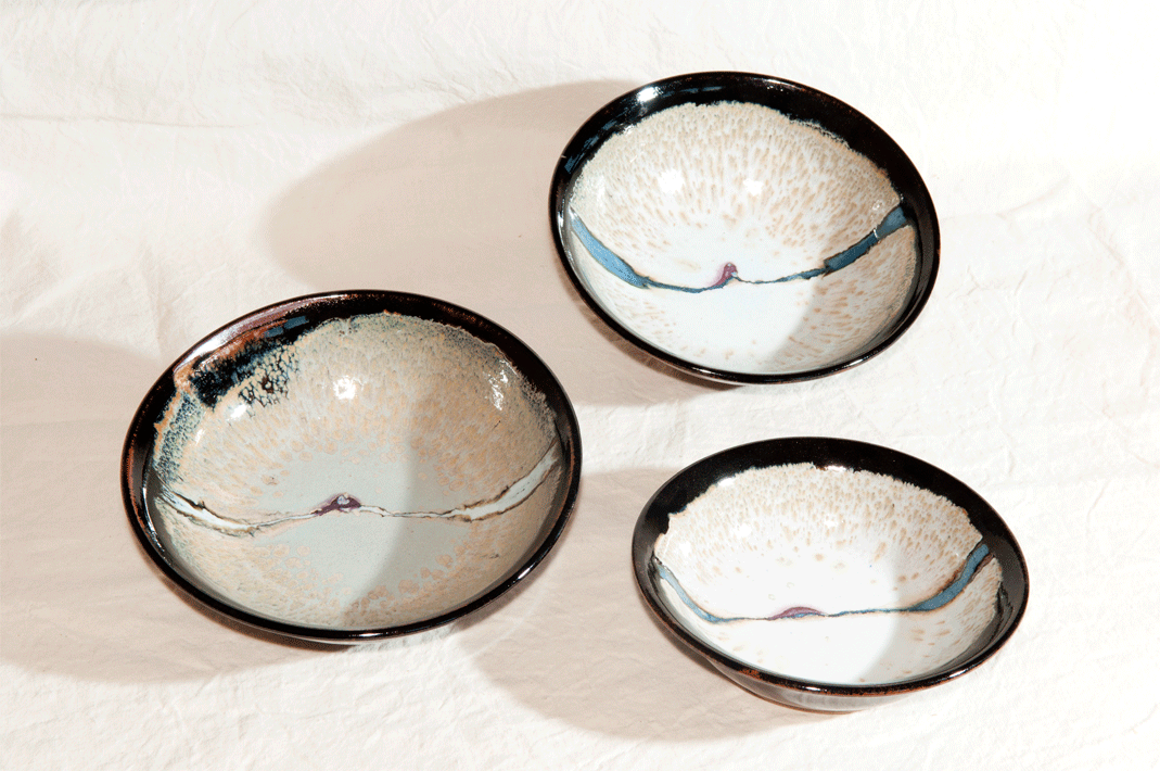 Quelques pièces expriment mon interêt pour les émaux de grès classiques (coupes et vases).